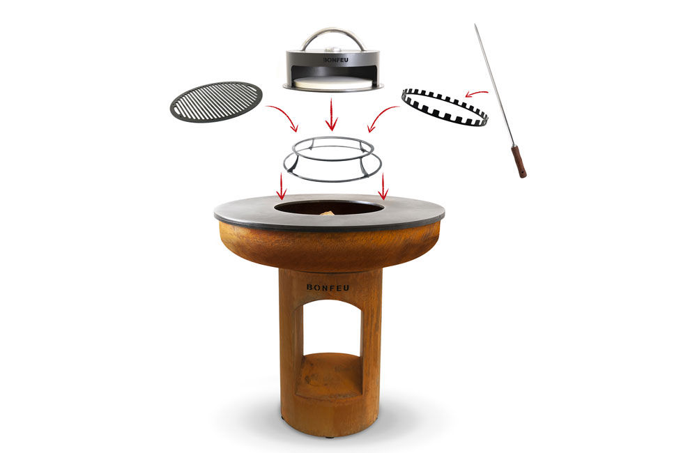 To make cooking on the BonBiza XL even easier, more fun, and more diverse, several accessories have been developed. These accessories are specially designed for the BonBiza XL and significantly enhance your cooking experience. With these accessories, you can enjoy three new cooking options: pizza baking with the BonPizza oven, making skewers with the BonFeu Skewers Ring, and grilling with the Grill for Stand.