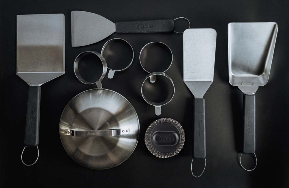 - Contains: plancha spatula, melting dome, 4 x stainless steel rings, scraper, brush, shovel, large spatula