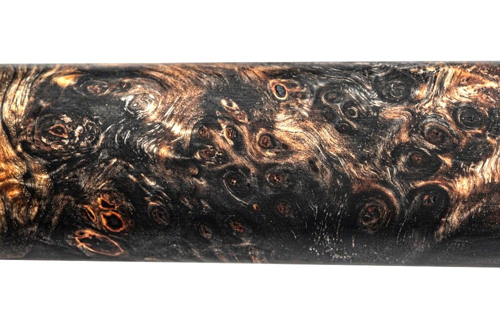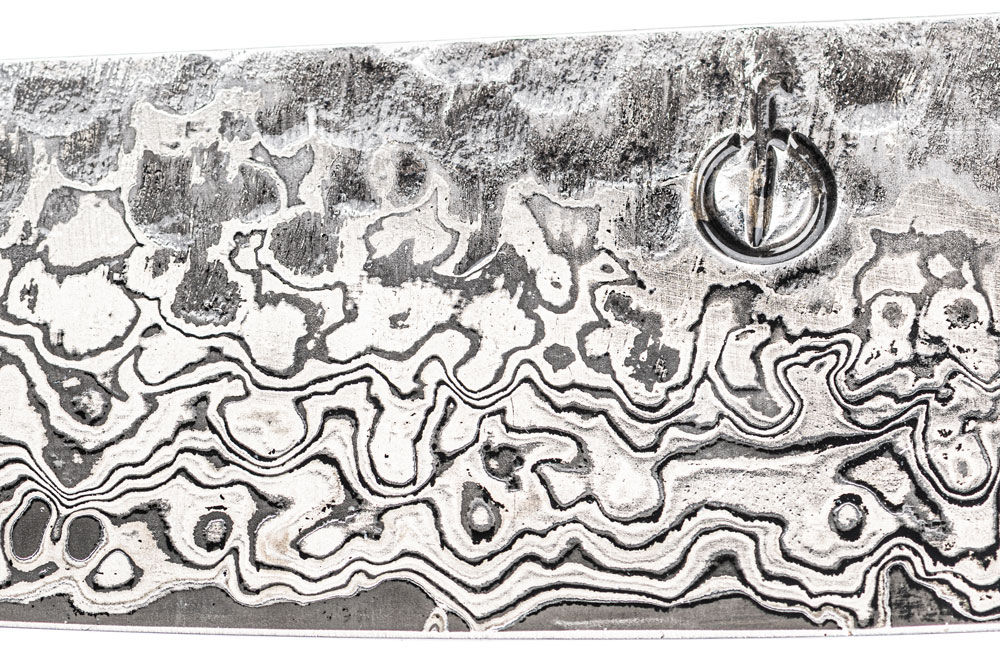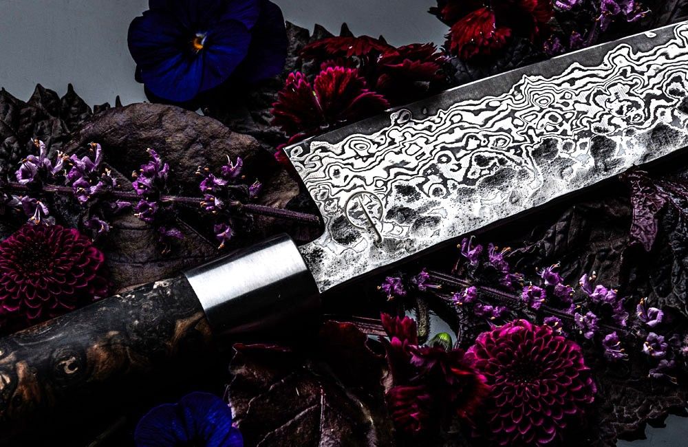 The knife has an elegant design with a rootwood handle i.c.m. resin which ensures durability. The beautiful pattern on the blade comes from the 67 layers of steel incorporating a special black substance, which accentuates the lines of the layers of steel.
