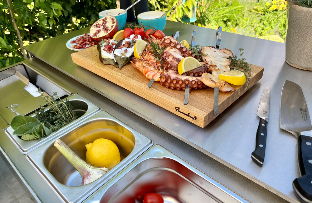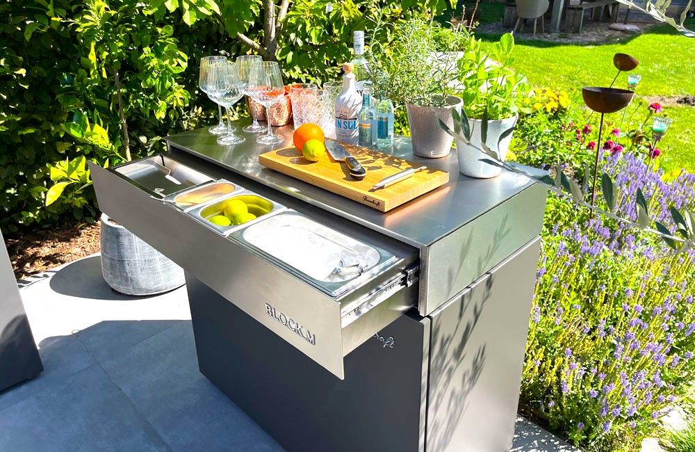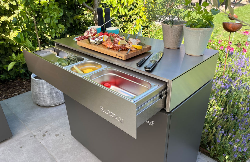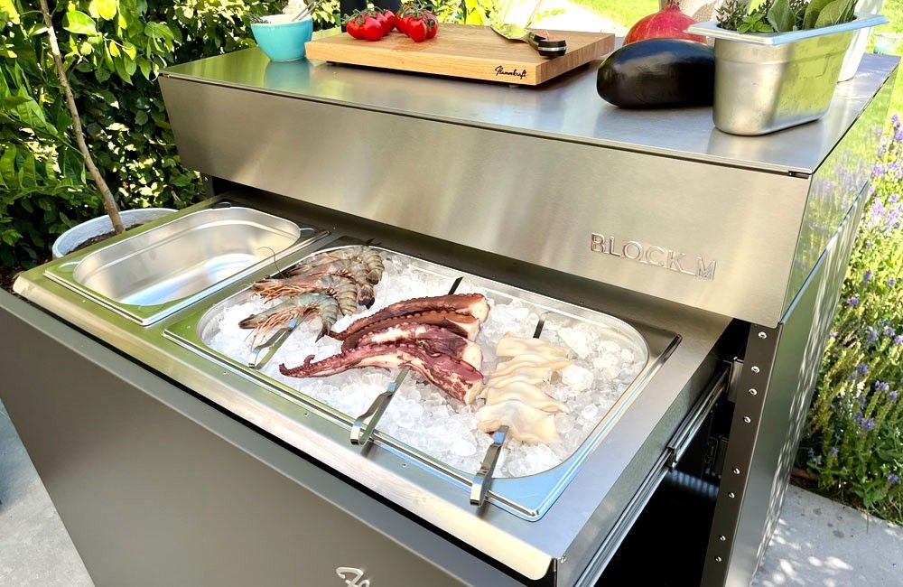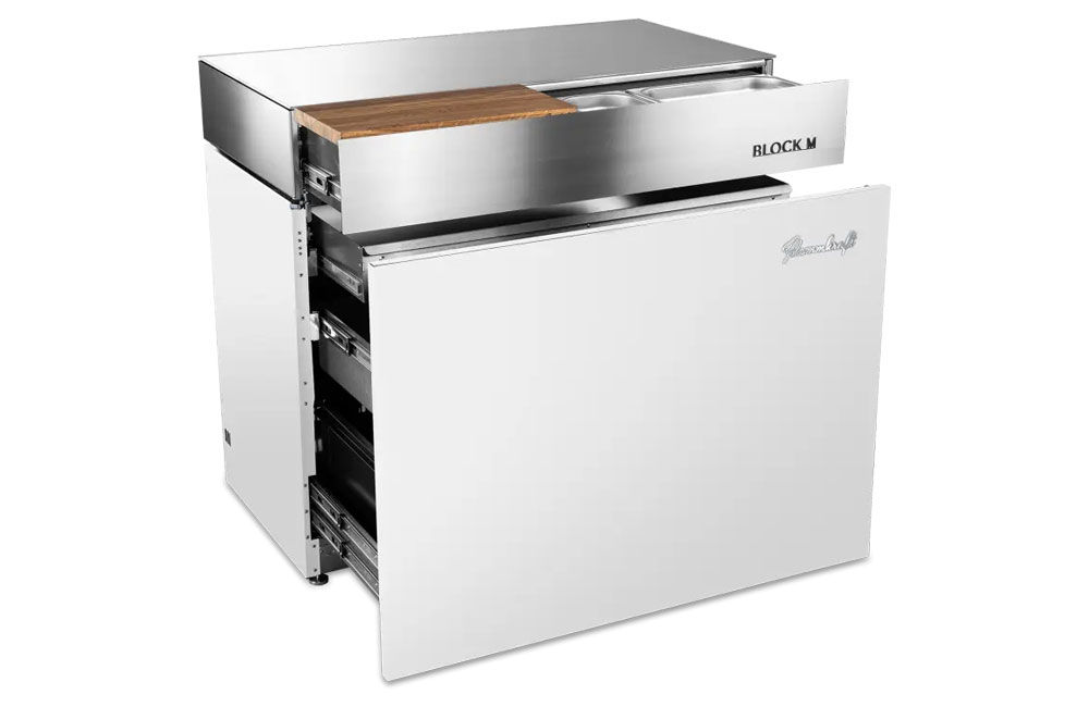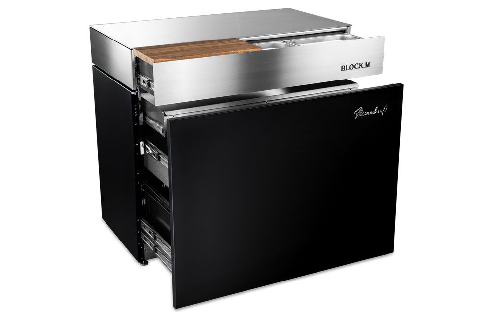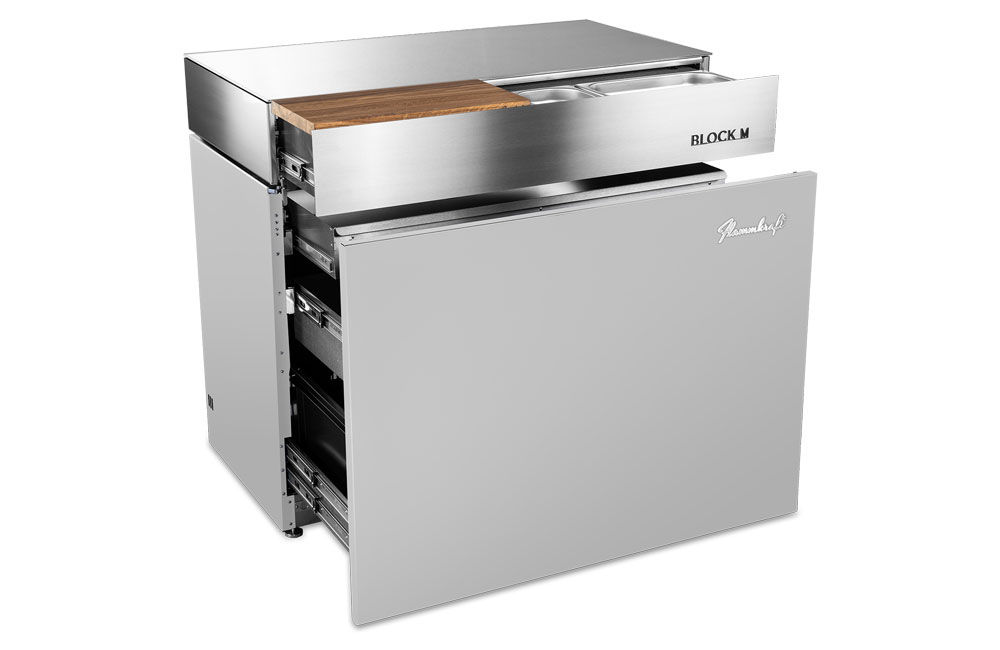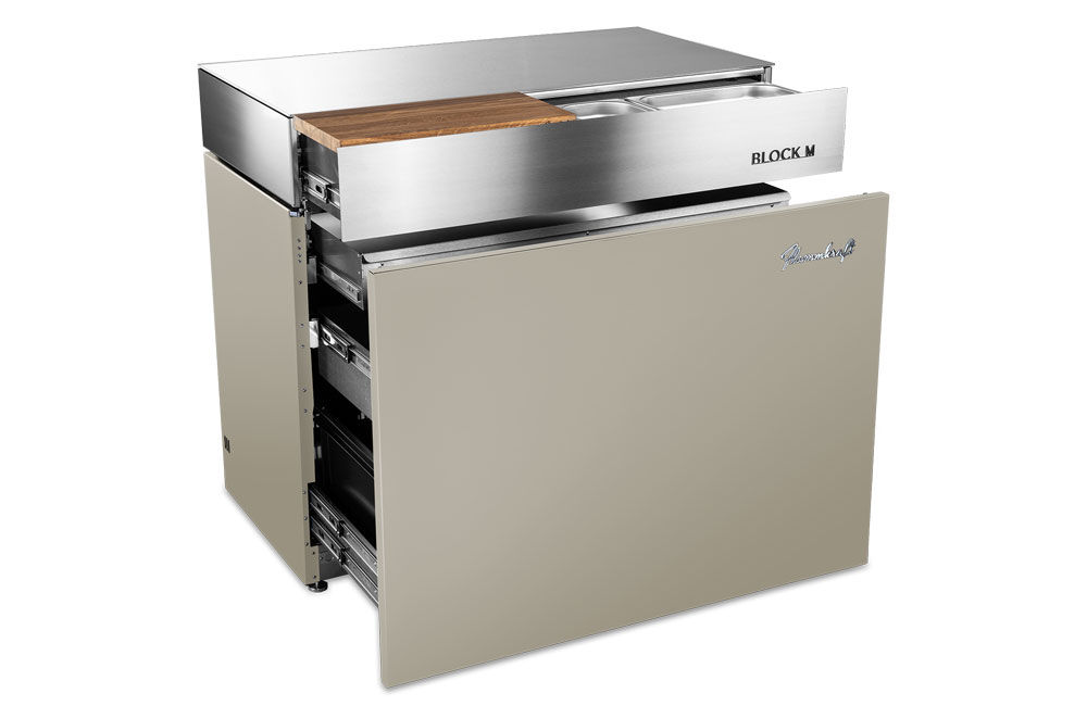 The Block M is an outdoor kitchen module made of 100% stainless steel in the identical base area and colours of the Block D, offering numerous storage options for accessories, a waste bin and a convenient solution for the preparation of ingredients. Even at a huge 130 kilograms, Block M remains mobile on four swiveable heavy-duty castors. Four stable feet ensure firm footing and optimal alignment. Inside, there are practical drawers and containers of very high quality. A matching cutting board/serving tray is also included. The outdoor kitchen module is topped off with a solid 4mm stainless steel plate - ideal for preparation and serving. The Block M is supplied fully assembled and perfectly complements the barbecues of the Block series in style and function.